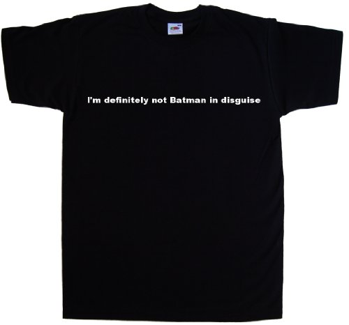 Black crew neck t-shirt with White slogan: "I'm Definitely Not Batman In Disguise". Fruit of the Loom Super Premium T-Shirt, 200gsm. The fabric has been preshrunk to ensure reduced shrinkage and includes a taped neck and twin needle stitching for neatness and strength.