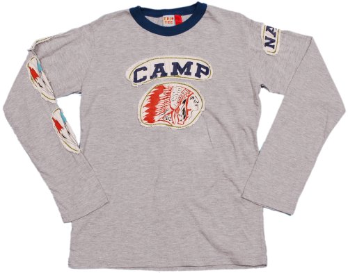 You may have seen some of Triptee's popular Dada-ist shirts on our site before. We are now proud to bring you a wide selection from their new Winter line. In our opinion it seems as though they are getting closer to perfecting their surrealist style. The 'Camp Napi' is a longsleeve heather-grey cotton shirt with a blue neckring and featuring several cotton patches sewn in with green thread. These patches are double sewn for extra stability. This is not the first time we have seen Triptee do a Native American themed design but they do it well. The Indian chief graphic on the front was just made to be put on a t-shirt. On the right sleeve are a series of feathers and on the left just the word ""Napi"" indicating the name of the camp where the Chief is likely sitting and beating on a small drum or maybe playing some video games.You can click above or to your left for more detailed images.100% cotton made in Mexico.